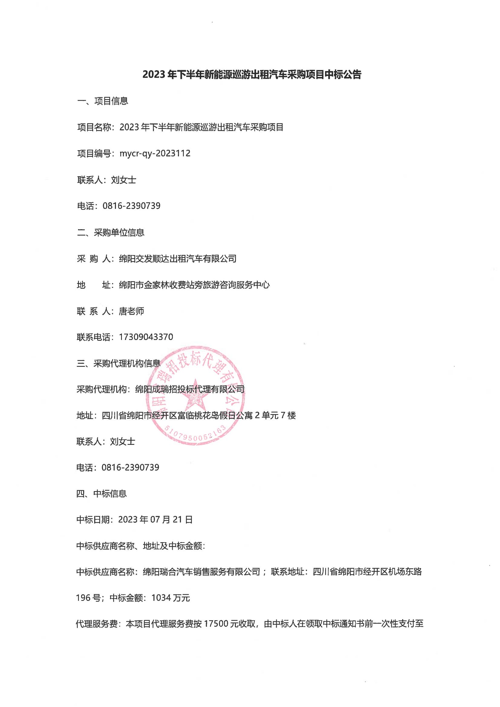 2023年下半年新能源巡游出租汽车采购项目中标公告